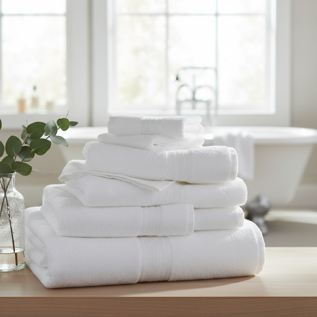 Linge de bain : draps de bain, serviettes, tapis et peignoirs, lavés et repassés selon les standards professionnels.